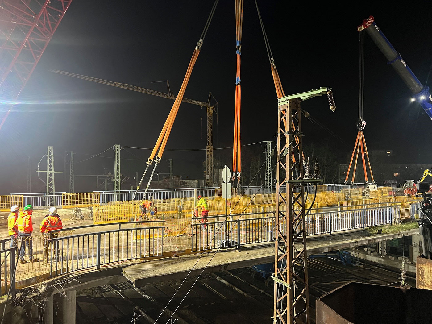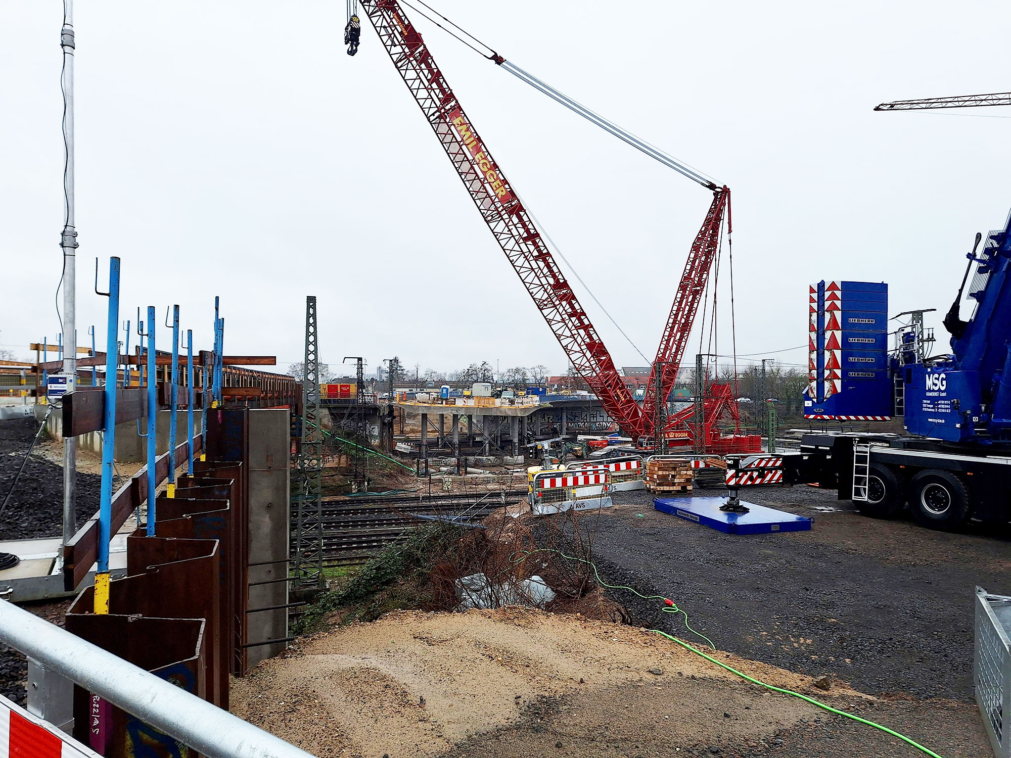 Aufmerksame Menschen in Hanau haben es vermutlich bereits gesehen: Rund um den Hanauer Hauptbahnhof hat sich bereits viel getan für den Ersatzneubau der 1958 erbauten Brücke. So wurden Widerlager gesetzt, in die in der Nacht von Freitag auf Samstag, 29. und 30. März, eine 42 Meter lange Behelfsbrücke eingehoben wird. Der für diese Arbeiten notwendige Schwerlastkran sowie die vormontierten Brückenteile werden bereits im Laufe der Woche angeliefert, die eigentlichen Arbeiten erfolgen dann innerhalb der von der Deutschen Bahn genehmigten Sperrpause zwischen 22 Uhr am Freitag und 22 Uhr am Samstag. „Wir haben ein straffes Zeitfenster, in dem alle Arbeiten abgeschlossen werden müssen. Beteiligt sind verschiedene Bauunternehmen, diverse Nachunternehmer, Sicherungsfirmen, Ingenieurbüros und natürlich unser Eigenbetrieb Hanau Infrastruktur Service. Somit ist diese große Maßnahme ein kleiner Ausblick darauf, wie umfangreich und arbeitsintensiv der Brückenneubau ausfallen wird“, sagt Stadträtin Isabelle Hemsley.