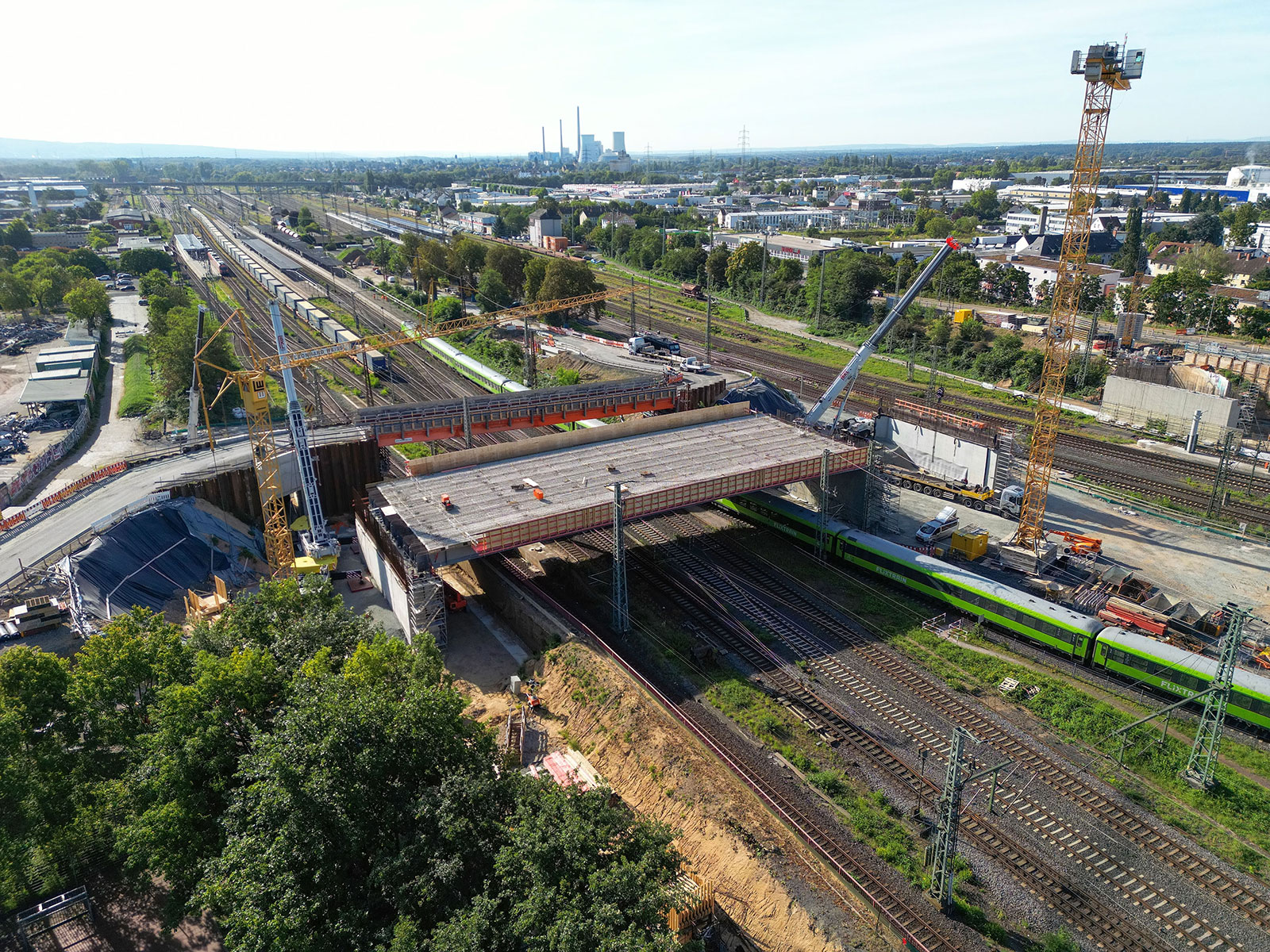 Am Wochenende vom 23. und 24. August wurden die ersten neun Verbundfertigteilträger für den Neubau der Hanauer Hauptbahnhofbrücke erfolgreich eingehoben. Die Träger bilden künftig die Grundlage für die Fahrbahn sowie die Fuß- und Radwege des nördlichen Brückenbauwerkes. Damit ist ein weiterer Meilenstein im größten Infrastrukturprojekt der Stadt seit Jahrzehnten erreicht. Die Arbeiten fanden während einer 32-stündigen Sperrpause des Bahnverkehrs statt. Sämtliche Abläufe, von der Anlieferung der rund 52 Meter langen Fertigteilträger über den anschließenden Einhub mit zwei Mobilkranen bis hin zur endgültigen Positionierung auf den neuen Widerlagerwänden, verliefen planmäßig. Auch beim Bahnverkehr gab es keine unvorhergesehenen Beeinträchtigungen; die Einschränkungen entsprachen genau den zuvor angekündigten Maßnahmen. ...