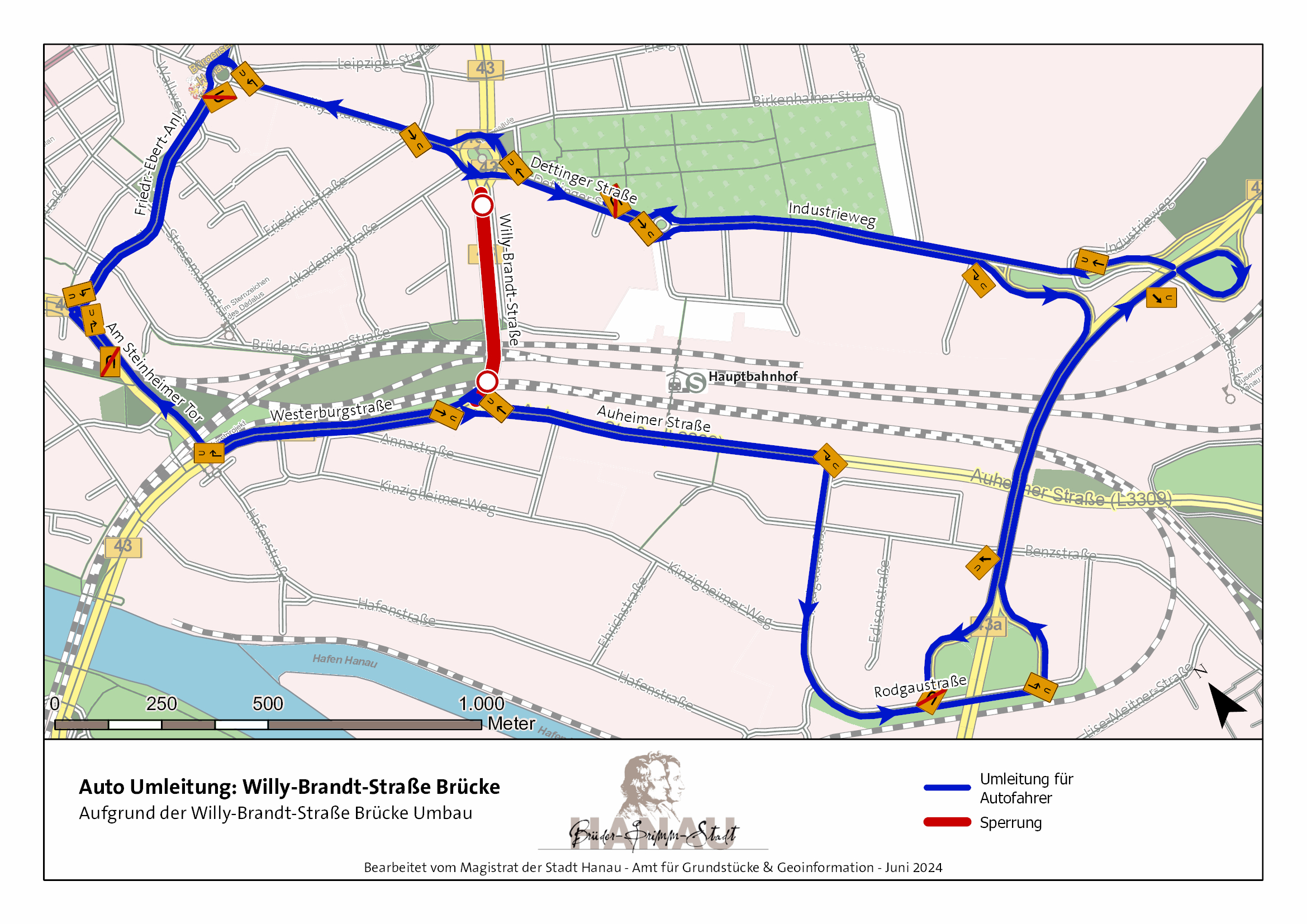 Verkehrsteilnehmende, die von der Auheimer Straße aus in Richtung Hauptbahnhof gelangen möchten, nutzen die hierzu ausgeschilderte Umleitung über die Strecke Westerburgstraße, Kinzigheimer Weg, Hafenstraße, Fußgängerunterführung B43/B45, Fußgängerunterführung Eisenbahnstrecken Am Pedro-Jung-Park, Unterführung B45, Brüder-Grimm-Straße, Akademiestraße, Dettinger Straße sowie Am Hauptbahnhof.