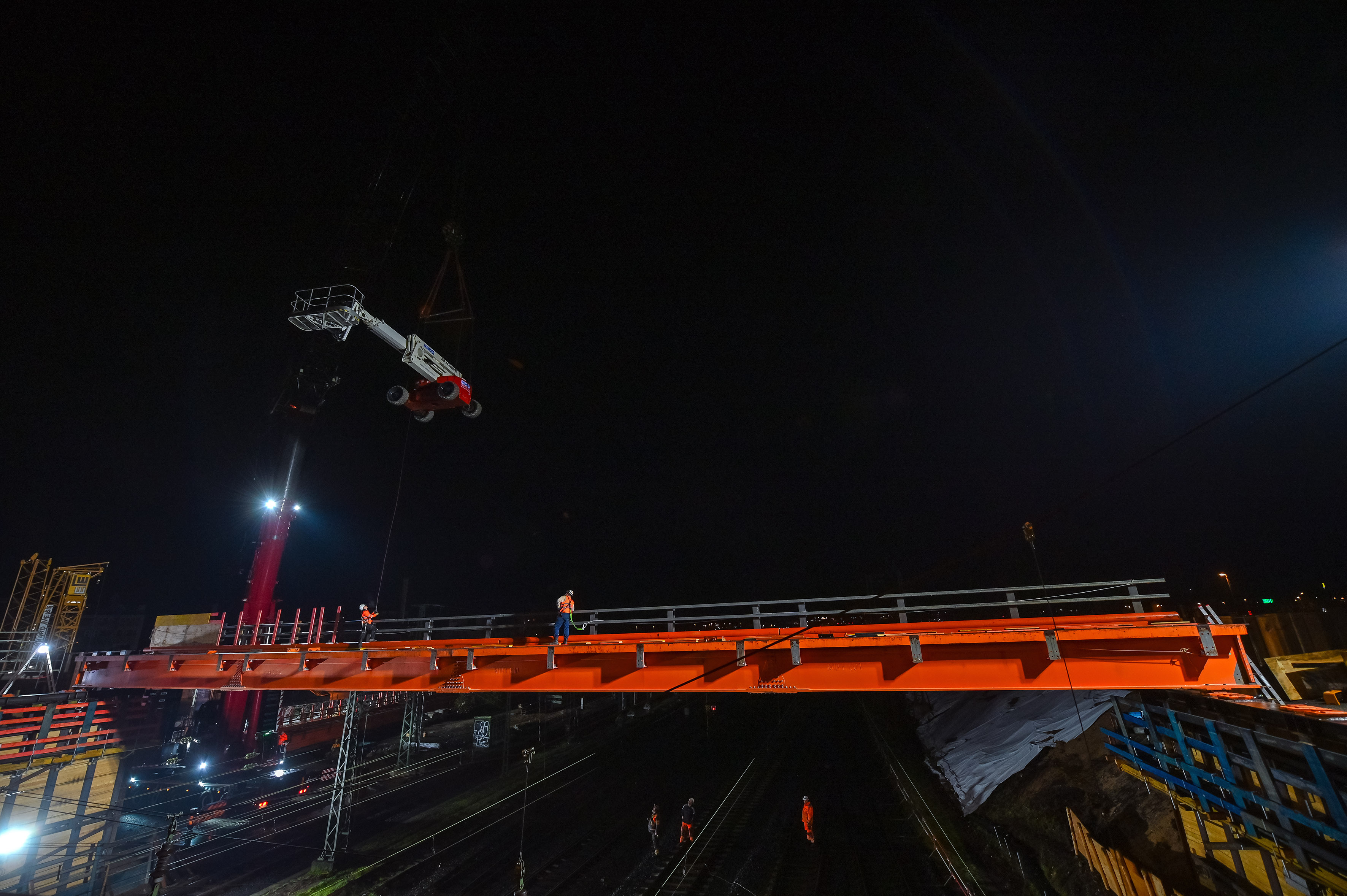 Am Wochenende 23. und 24. August werden während einer 32-stündigen Sperrpause des Bahnverkehrs insgesamt neun Verbundfertigteilträger eingehoben, auf denen später die Fahrbahn sowie die Fuß- und Radwege verlaufen.