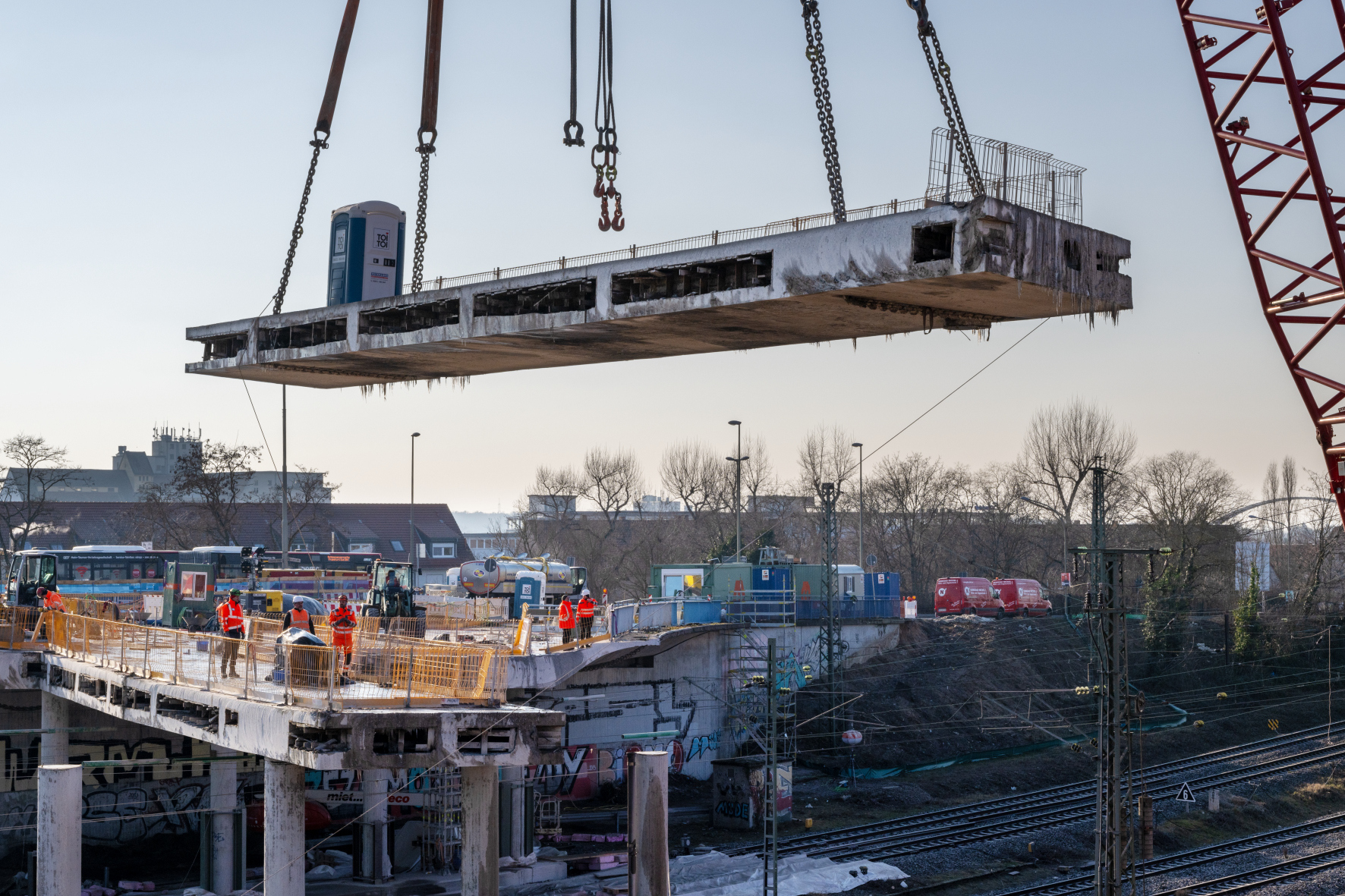 Die zweite Abriss-Phase beginnt am 14. Februar um 22 Uhr. Dann werden das südliche Gleisfeld gesperrt und die Erdung der abgeschalteten Oberleitungen vorgenommen. Direkt im Anschluss starten die Vorbereitungen, um die einzelnen Brückensegmente präzise zu trennen. Der erste Aushub ist für den 17. Februar geplant. Der 62 Meter lange Brückenabschnitt wird in 14 Segmente mit einem Gesamtgewicht von rund 2.400 Tonnen zerschnitten. Die einzelnen Segmente wiegen zwischen 110 und 250 Tonnen. Erneut kommt dabei ein Raupenkran zum Einsatz, der die Segmente in der Kleingartenanlage ablegt, in der die Abbruchbagger bereits die tonnenschweren Teilstücke des nördlichen Abrisses transportgerecht zerkleinern. Abschließend erfolgt der Abbruch des südlichen Widerlagers.