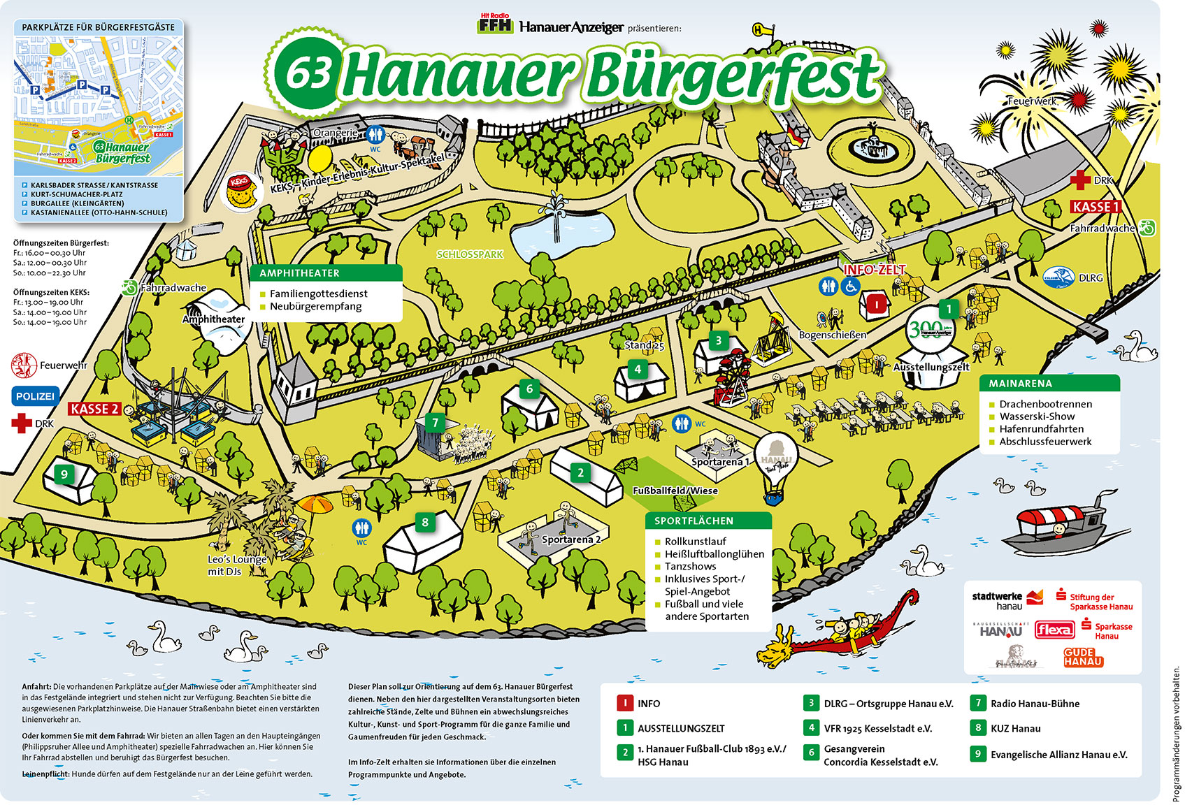 Zum 63sten Mal feiert Hanau vom 5. bis 7. September am Mainufer unterhalb von Schloss Philippsruhe das Bürgerfest. Das vielfältige Programm bietet den Festbesucherinnen und -besuchern wieder eine große Auswahl an Attraktionen: Jede Menge Livemusik vom Feinsten, buntes Kinder-Erlebnis-Kultur-Spektakel an der Orangerie, atemberaubende Vorführungen der Tanz- und Sportvereine, sportlich ambitionierte Drachenbootrennen, eine Wasserski-Show mit erstaunlichen Lichteffekten, kurzweilige Hafenrundfahrten, historische Ausstellungen, Night-Glow mit Heißluftballonen und natürlich ein riesiges Angebot an Speisen und Getränken aller Art sowie das mitreißende Abschlussfeuerwerk am Sonntagabend.