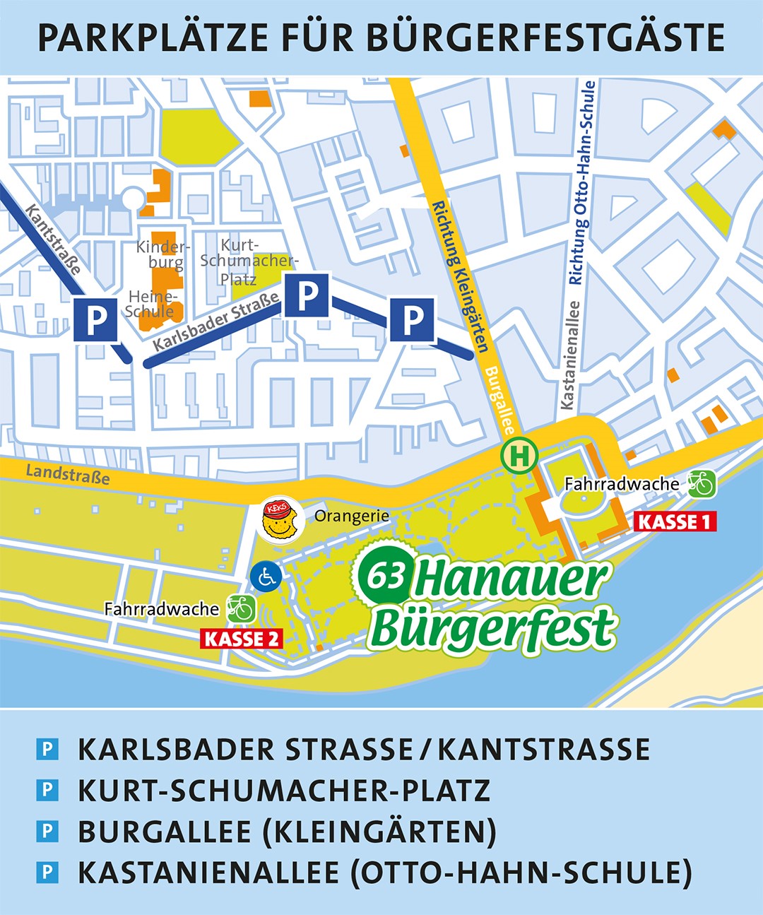 es stehen beim Bürgerfest nur eine begrenzte Anzahl an Parkplätzen zur Verfügung. Nutzen Sie daher die Angebote der Hanauer Straßenbahn oder – wenn Sie mit dem Fahrrad kommen – stellen Sie ihr Fahrrad einfach in einer der beiden Fahrradwachen ab.