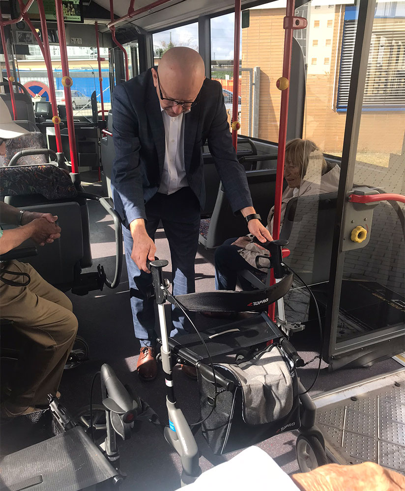 Fachkundig und sehr anschaulich beantwortete er alle Fragen rund um den Rollator, das Einsteigen und Fahren mit dem Bus sowie die Sicherheit. ‚Machen Sie auf sich aufmerksam. Ihnen wird geholfen. Haben Sie keine Scham um Hilfe zu bitten. Ist Hilfe nötig helfen die meisten Menschen, auch die Jüngeren!‘ so Rüfer, der das Training jetzt bereits zum 10. Mal begleitete. ‚Und ganz wichtig: Halten Sie sich immer richtig fest. Es kann vorkommen, dass der Fahrer unvorhergesehen und heftig bremsen muss.‘