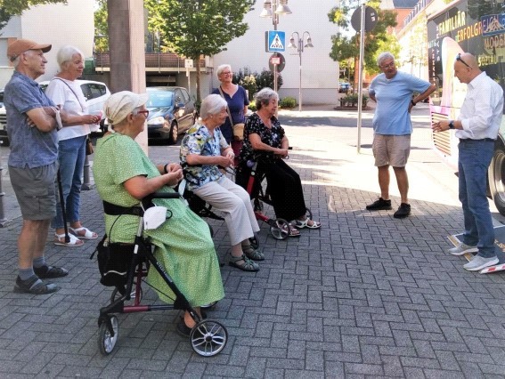 Herr Ruefer von der HSB, der das Rollatorentraining durchführte, hatte zur Veranschaulichung in Praxis und Theorie viele Beispiele aus dem Alltag parat. Allen Teilnehmer*innen (insgesamt 3 Rollator-Nutzerinnen, und 6 Interessierte, davon 5 Teilnehmer*innen vom Seniorenbeirat der Stadt Hanau) wurde klar, dass die Nutzung eines Rollators im Bus eine logistische Aufgabe ist.