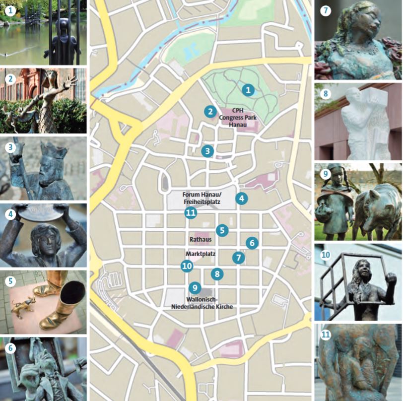 Nach einem jurierten, nationalen Bildhauerwettbewerb mit über 170 Einsendungen von 74 renommierten Künstlerinnen und Künstlern wurden im Frühjahr 2016 zehn Märchenskulpturen in der Innenstadt realisiert. Zusammen mit den Orten der einstigen Geburts- und Wohnhäuser der Familie Grimm und natürlich dem Nationaldenkmal auf dem Neustädter Marktplatz bilden sie den „Hanauer Märchenpfad“. Die Skulpturen zeigen „Märchen aus der Maingegend“, die den Brüdern Jacob und Wilhelm Grimm einst von Jeanette, Amalie und Marie Hassenpflug für ihre berühmte Sammlung der Kinder- und Hausmärchen erzählt worden sind. Alle hochwertigen Kunstwerke konnten durch Patenschaften von Hanauer Bürgerinnen und Bürgern sowie Hanauer Stiftungen realisiert werden. Sie erfreuen täglich viele Hanauerinnen und Hanauer und Gäste aus Nah und Fern.