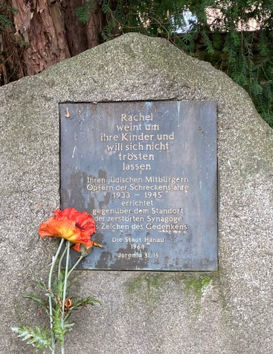 Die Gedenkstätte an die Reichspogromnacht 1938 und die ehemalige Hanauer Judengasse (seit 1898 Nordstraße) befindet sich gegenüber dem Standort der ehemaligen Synagoge. Das Gebäude wurde am 10. November 1938 von NS-Schergen in Brand gesteckt und zerstört.
