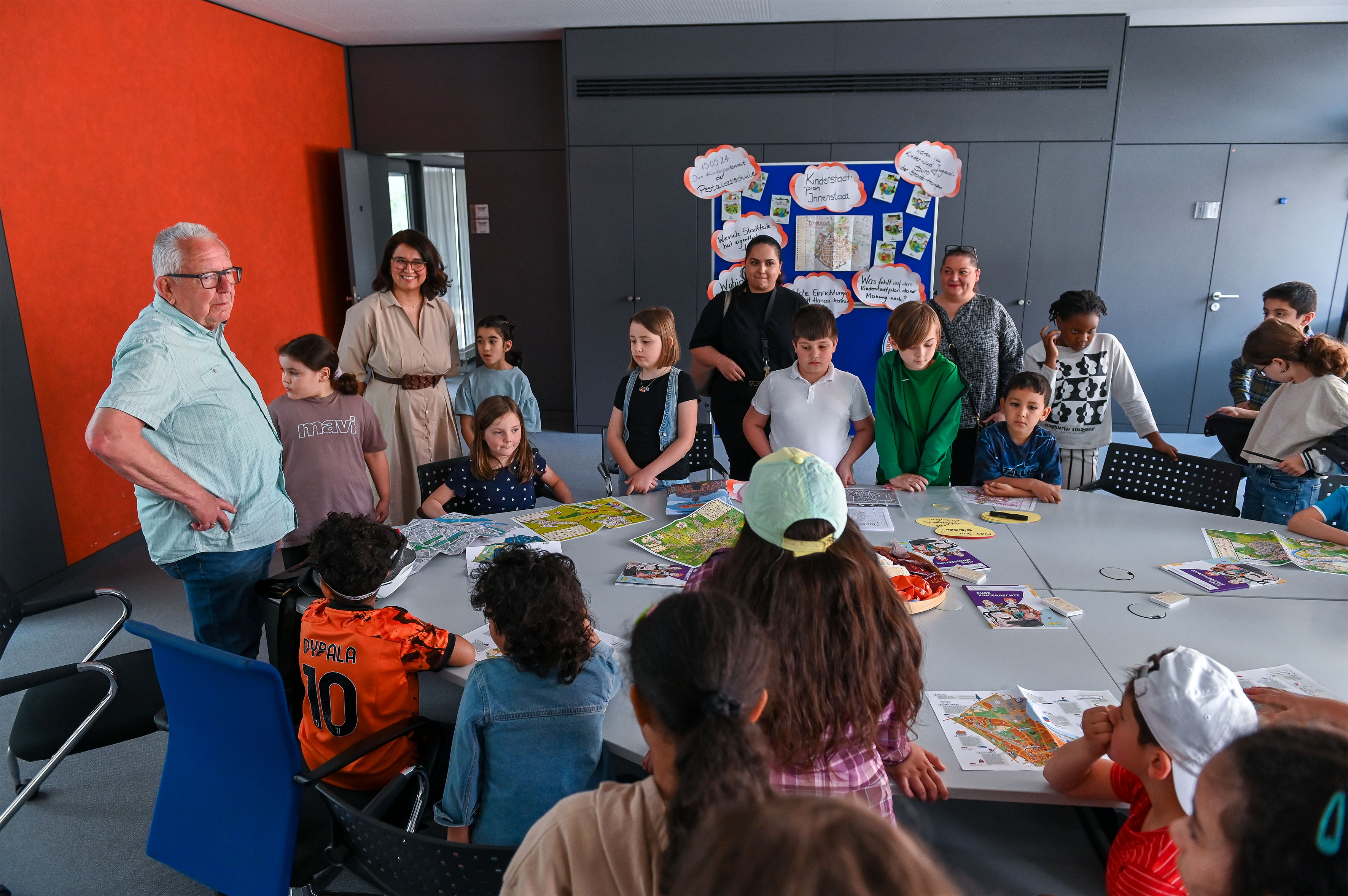 Empfangen wurden sie von Gökben Akdemir vom Kinder- und Jugendbüro der Stadt Hanau, die derzeit dabei ist den Kinderstadtplan für die Innenstadt zu aktualisieren. „Die Pläne sind alle vergriffen und es ist Zeit für eine Neuauflage“, erklärt sie, „doch ich wollte unbedingt, dass so viele Kinder wie möglich partizipieren und ihre Wünsche für den Stadtplan mitteilen. Auch Ortsvorsteher Wilfried Schneider war eingeladen, um sich einen Überblick zu verschaffen, welche Wünsche die Kinder in Bezug auf den Innenstadtplan haben und um den jungen Gästen zu erläutern, welche Aufgaben ein Ortsvorsteher hat.