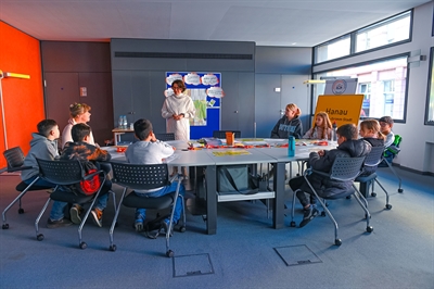 Beklagt wurde von den Kindern auch der Mangel an Aufenthaltsorten für Kinder und Jugendliche in der Innenstadt und fehlende Sitzmöbel in der Stadtbibliothek. Die Kinder thematisierten zudem Probleme an der Schule: Rassismus, zu große Klassen, Mobbing und fehlende Digitalisierung wurden angesprochen. Die Vertreterinnen und Vertreter der Stadt hörten sich die Anliegen der Kinder in kleinen Arbeitsgruppen – sognannten „Themeninseln“ an, die rund um verschiedene Themen gebildet wurden und präsentierten die Ergebnisse anschließend vor dem gesamten Plenum. Andere Wünsche und Anregungen nahmen sie mit in ihre jeweiligen Abteilungen und Fachbereiche, um sie auf Machbarkeit zu prüfen.
